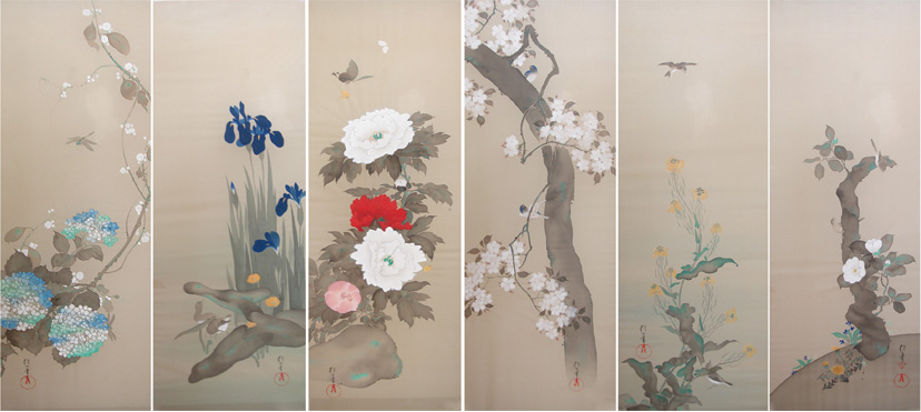 「十二ヵ月花鳥図貼付屏風(一月~六月)」