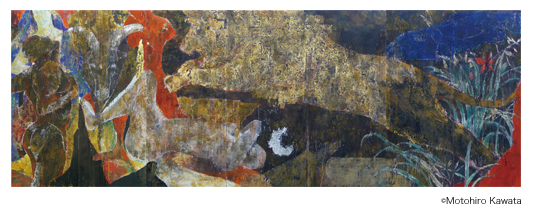 木製パネル、寒冷紗、水干絵具、岩絵具、釉薬、顔料、木炭、パステル、金箔162.1×130.3cm